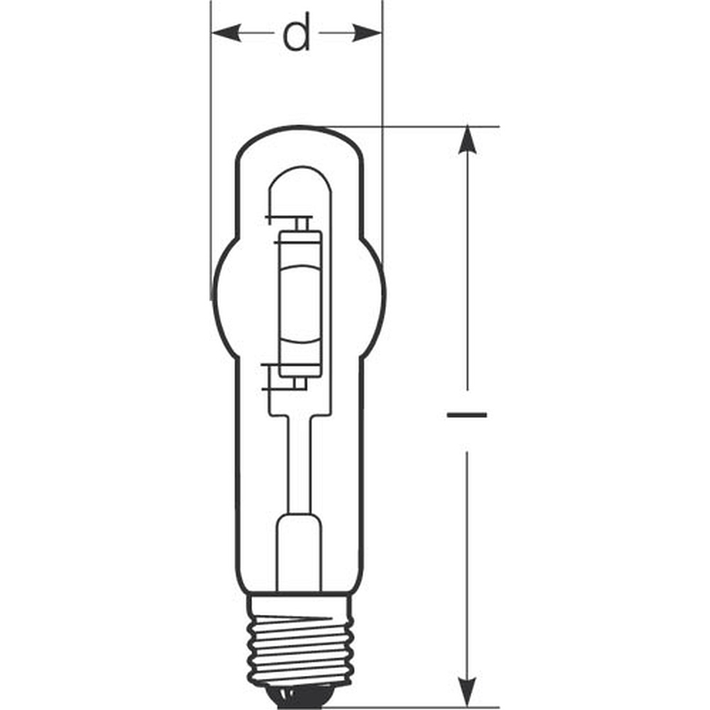 Diese Halogenmetalldampflampe besitzt einen Sockel vom Typ E40 und misst 6,2 cm im Durchmesser bei einer Länge von 28,5 cm. Die Lampe arbeitet mit einer Betriebsspannung von 230 V AC und einer Lampenspannung zwischen 115 und 125 V. Sie hat eine Lichtausbeute von 81 Lumen pro Watt und erzeugt einen Lichtstrom von 34.000 Lumen. Mit einem Energieverbrauch von 420 kWh pro 1000 Betriebsstunden ist sie effizient und bietet eine mittlere Lebensdauer von 12.000 Stunden.