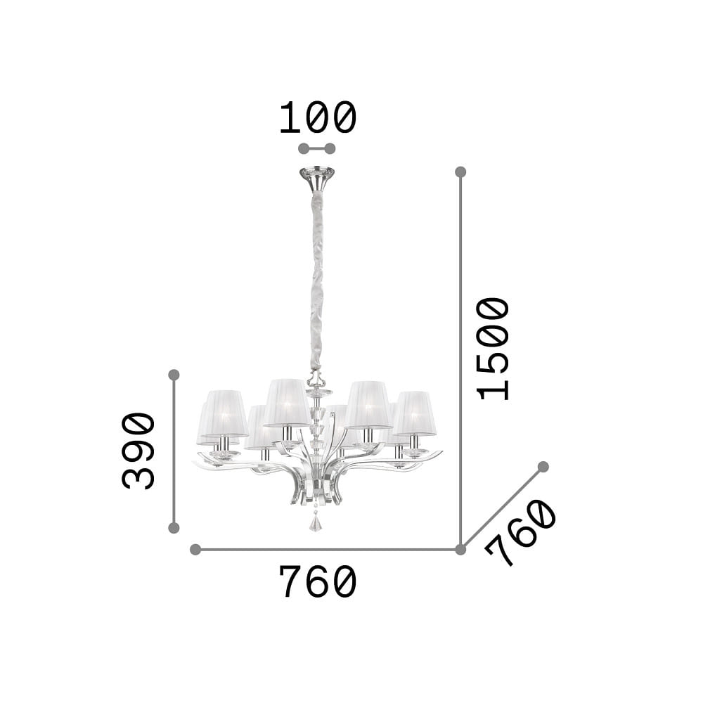Die Kristall-Pendelleuchte PEGASO ist ein wahrer Blickfang in jedem Zuhause. Mit 8 Flammen und einem Durchmesser von 76 cm sorgt sie für ein helles und strahlendes Licht. Die E14 Fassungen ermöglichen es, die Leuchte mit verschiedenen Leuchtmitteln zu betreiben.