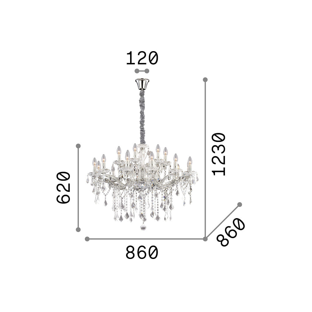 Der Kronleuchter FLORIAN SP18 von Ideal Lux ist ein imposantes Beleuchtungselement mit 18 Flammen. Er verfügt über E14 Sockel für die Leuchtmittel und hat eine Betriebsspannung von 220-240V~. Mit einer Größe von Ø 86cm und einer Höhe von 95cm ist er ein echter Blickfang in jedem Raum.