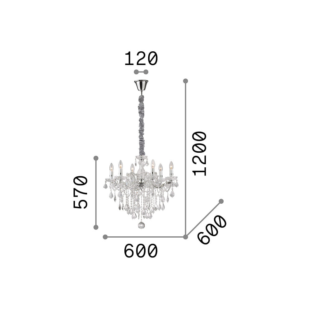 Der Kronleuchter FLORIAN SP6 von Ideal Lux ist ein eleganter 6-flammiger Kronleuchter, der mit E14-Leuchtmitteln betrieben wird. Er hat eine Größe von Ø 60 cm und eine Höhe von 77 cm. Das transparente Design mit Kristallglas und verchromten Metallelementen verleiht jedem Raum ein edles Ambiente.