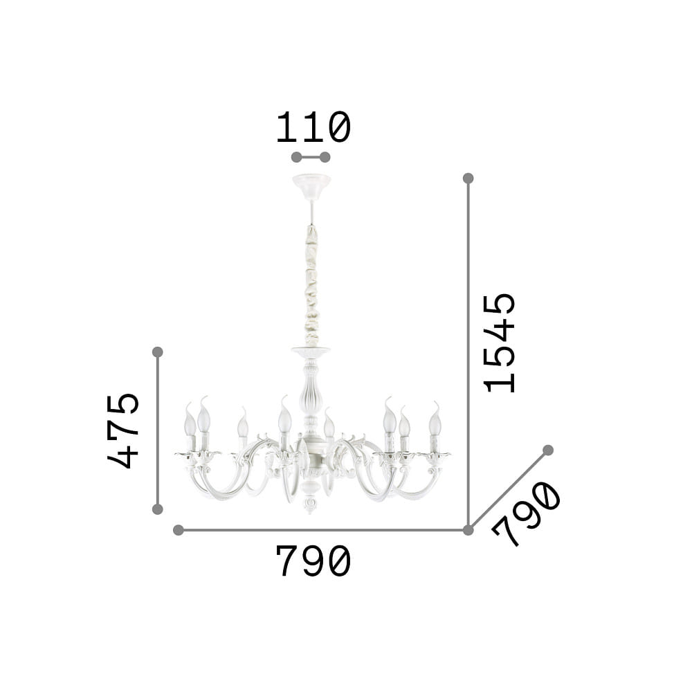Der Kronleuchter JUSTINE ist ein elegantes Beleuchtungselement mit 8 Flammen und einem Durchmesser von 79 cm. Hergestellt aus hochwertigem Metallguss in Weiß, verleiht er jedem Raum eine luxuriöse Note.