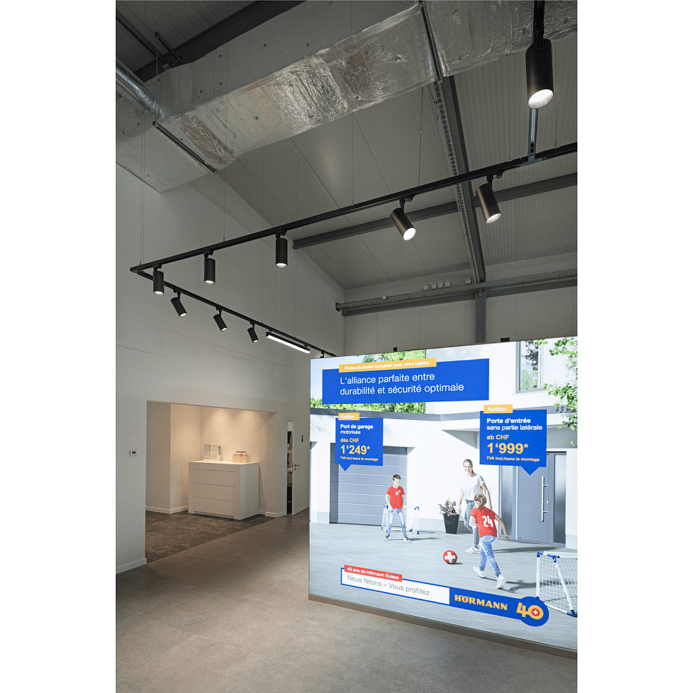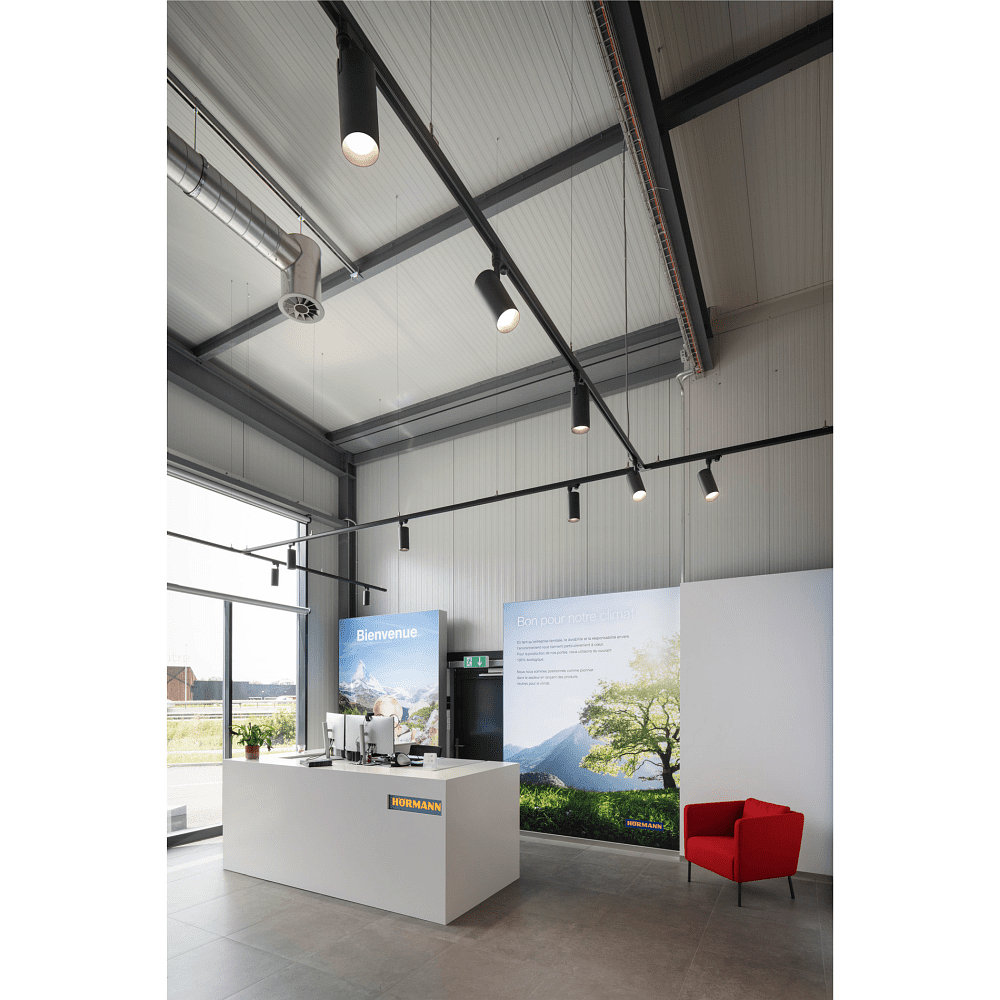 The 3-phase spotlight is made of aluminum and polycarbonate (PC), giving it high durability and stability. The black lacquered surface provides an elegant look, while the white decorative ring (accessory) offers additional design possibilities.