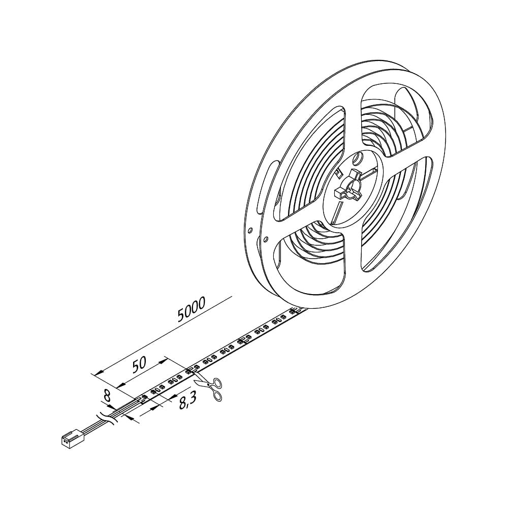 The strip has a color temperature of 2000K and a color rendering index of 80-89Ra. With a beam angle of 120°, it provides uniform illumination. The operating voltage is 24V= and the protection class is IP20.