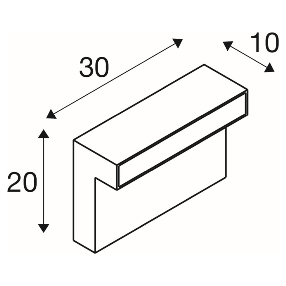 Die eckige Form der Leuchte sorgt für eine homogene und blendfreie Lichtverteilung nach unten und zur Seite. Die opale PC-Abdeckung sorgt für ein gleichmäßiges Flächenlicht. Die Lichtaustrittgröße beträgt 5x5cm und die Größe der Leuchte insgesamt beträgt 30x20x10cm.