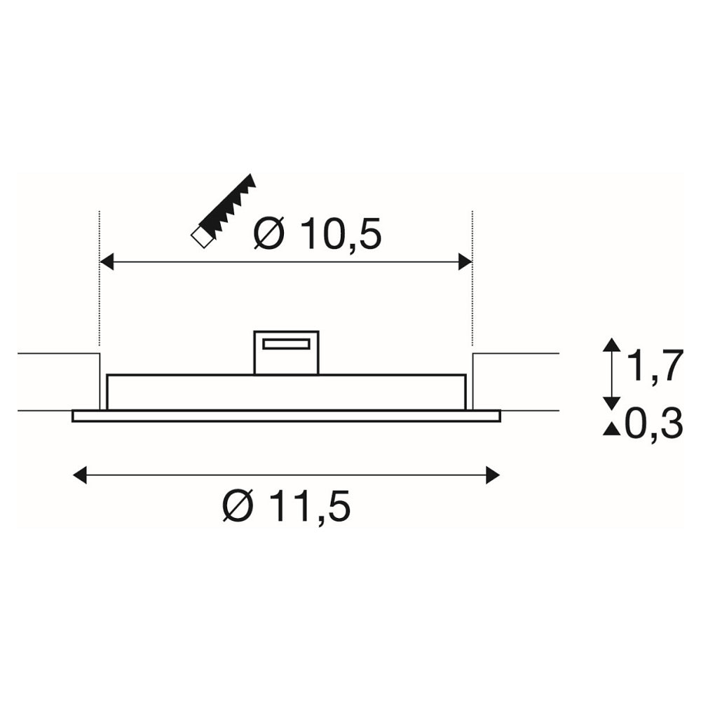 The recessed ceiling light SENSER 12 DL has a size of Ø/ H: 11.5/ 2 cm and is made of high-quality white aluminum. With a weight of only 0.1kg, it is light and easy to install. The installation depth is 3cm and the installation opening circle Ø measures 10.5cm.