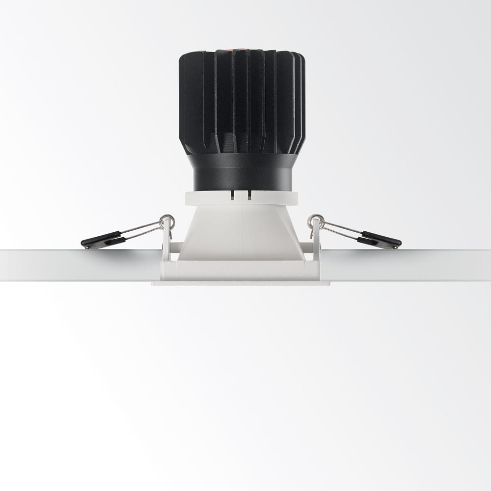 Die Decken-Einbauleuchte ist mit einem rückversetzten CREE COB LED Modul ausgestattet und verfügt über eine geringe Blendwirkung, was sie ideal für die Beleuchtung an Bildschirm-Arbeitsplätzen macht. Sie ist in verschiedenen Lichtfarben und Gehäusefarben erhältlich. Dimmbare Treiber (1-10V / DALI) sind verfügbar, müssen jedoch separat bestellt werden.