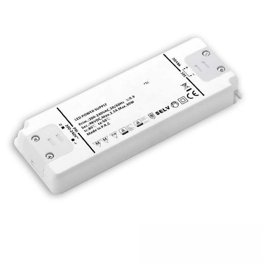 The LED transformer 48V/DC from ISOLED is ideal for indoor use. With an operating voltage of 220-240 volts and a maximum current load of 1.25 amperes, it provides a reliable power supply for your LED lighting. Thanks to the ENEC certification, you can rely on the safety and quality of this ultra-flat SELV transformer.