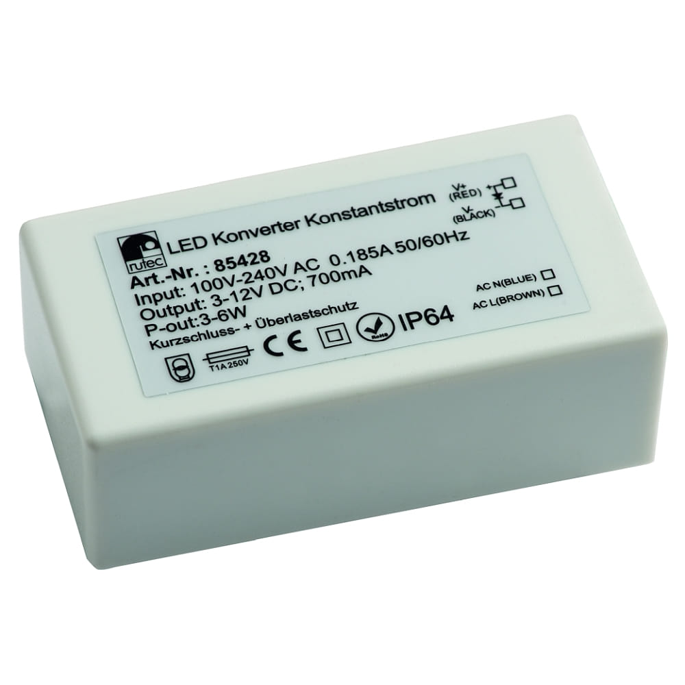 The switchable Rutec Project LED driver is a constant current converter for use indoors and outdoors. With an operating voltage of 100-240V AC and an output current of 700mA, it is ideal for LED lighting applications with a power of 3-6W.