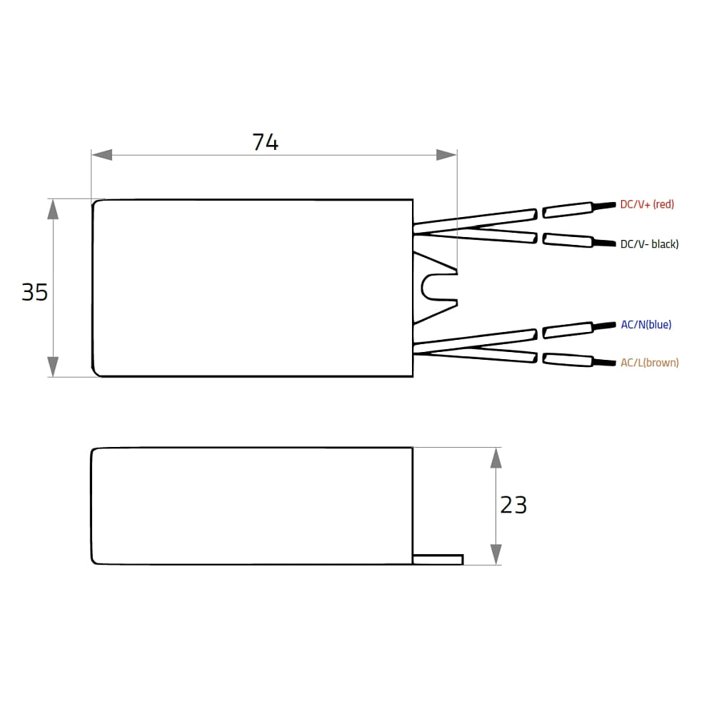 The LED converter has an IP65 protection class, making it resistant to dust and temporary submersion. The size of the device is 7.4 x 3.5 x 2.3 cm and it can be operated at ambient temperatures of -10 to +40°C. The power connection is made via terminals and the mains frequency is 50/60Hz.