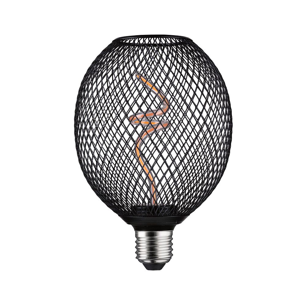 The METALLIC GLOW GLOBE LED bulb from Paulmann impresses with its decorative yet modern design. The lamp is designed in an open metal cage in globe shape, giving the bulb an elegant and at the same time industrial look. The black metal frame surrounds the single LED filament, which is held by a twisted glass tube. With a diameter of 11 cm and a length of 16 cm, the lamp is a real eye-catcher in any room.