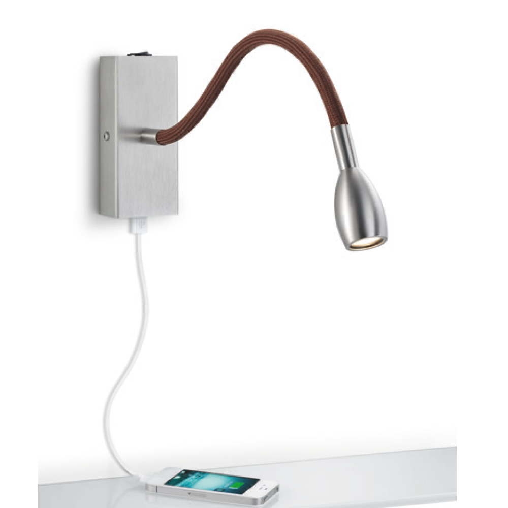 LED Flexarm-Wandleuchte ASTA, Aufbau, 2.6W 2700K, CRi >90, mit USB-Ladeport + Schalter, Mattnickel / braun