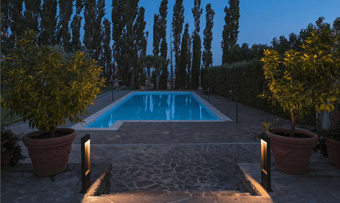 The floor lamp is ideal for ground use in outdoor areas and comes with included light bulbs. Additionally, accessories such as connection cables, light color switches, and drivers are included. The junction box is not included in the delivery.