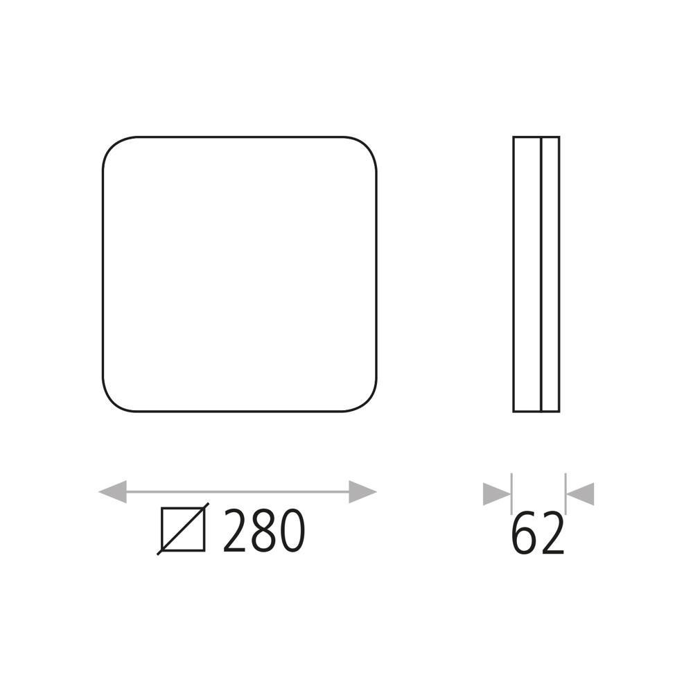 The square light has a size of 28x28x6.2 cm and is made of acrylic. With a beam angle of 120° and a diffuse light distribution, it creates a pleasant lighting environment. The IP54 protection ensures weather resistance and protection against foreign objects. The light has a protection class of 2 and an ambient temperature of 698°C.