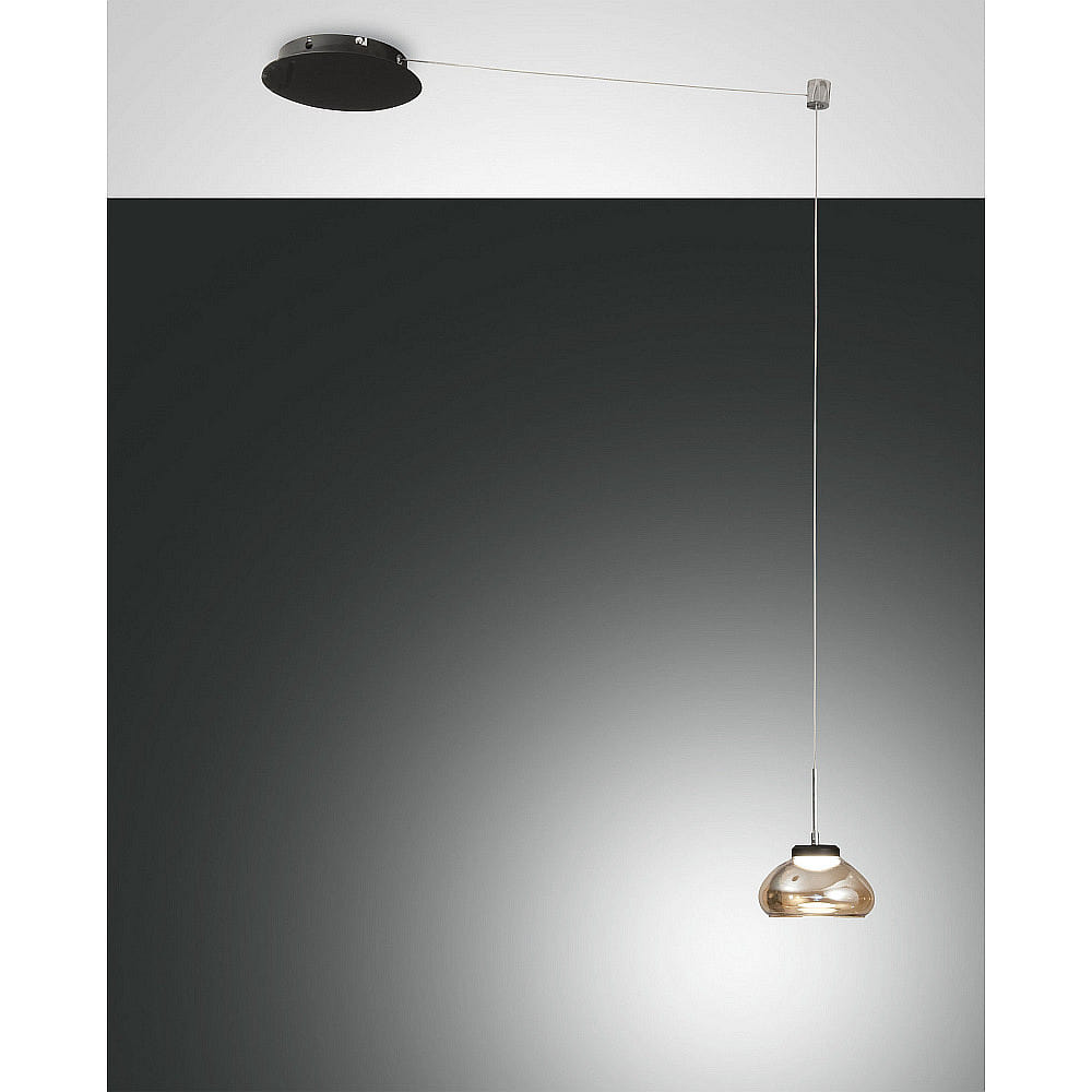 The ARABELLA pendant light has a diameter of 14 cm and a size of 350 x 350 cm. The weight is 1.15 kg. The light is in an elegant black with an amber tone and harmoniously blends into any living environment.