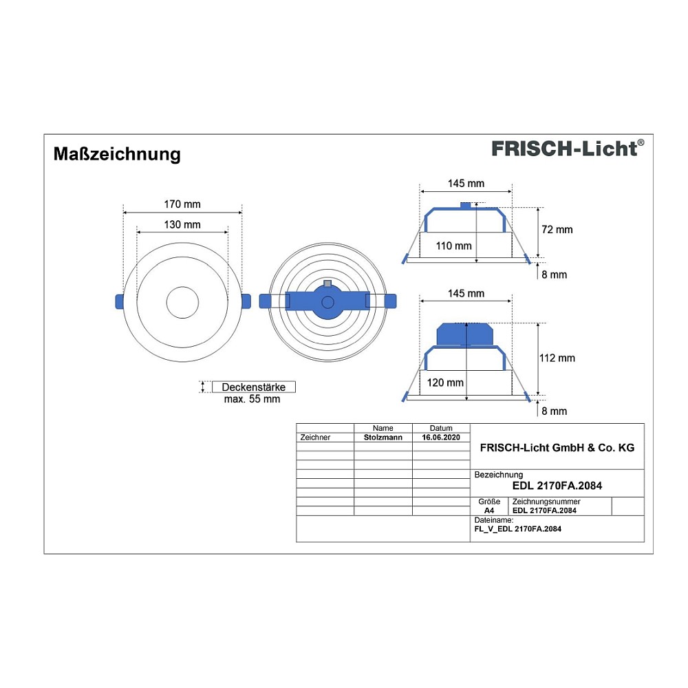 The LED recessed downlight from Frisch-Licht impresses with its high-quality workmanship and efficient light output. With a power consumption of 20 watts, it produces a luminous flux of 2000 lumens, providing bright and pleasant room illumination. The fixture is round in shape and has a mounting depth of 11.2 cm, making it ideal for installation in suspended ceilings. Thanks to the faceted reflector, the light is optimally focused and evenly distributed.