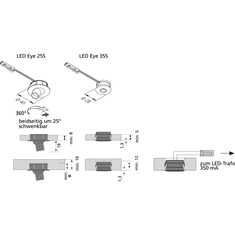 Thanks to the recessed mounting method and the LED-350 plug system, the installation of the LED recessed spotlight is uncomplicated and quick. The spotlight is suitable for use in furniture and on walls, and is intended for indoor use only.