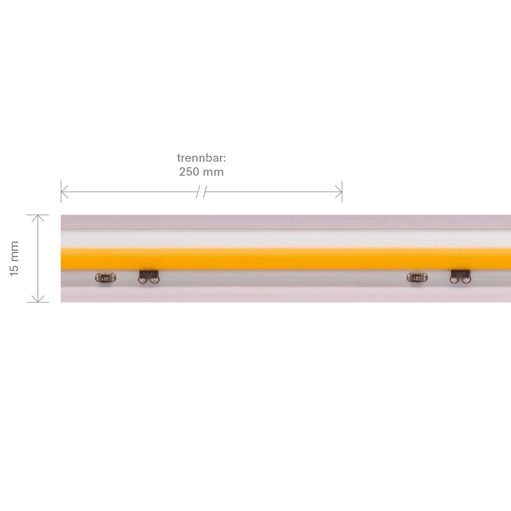 The 14W/m high-voltage COB LED strip from the 10m set with 144LED/m offers an impressive light output of 890lm/m at an operating voltage of 230V. With a color rendering index of 90Ra, it produces a pleasant warm white light with a color temperature of 3000K.