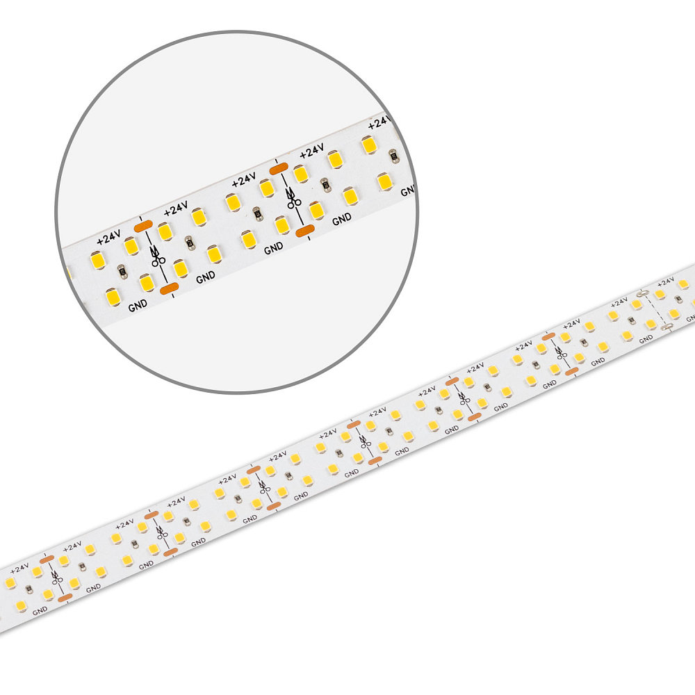The double-row LED strip is 5 meters long, 2 cm wide, and only 0.2 cm thick. It operates at a voltage of 24 volts DC and features a beam angle of 120 degrees, providing even light distribution. The flex strip is designed to be transparent and white, allowing it to blend unobtrusively into various environments. Please note that the product is not self-adhesive and the mains connection must be made by soldering.