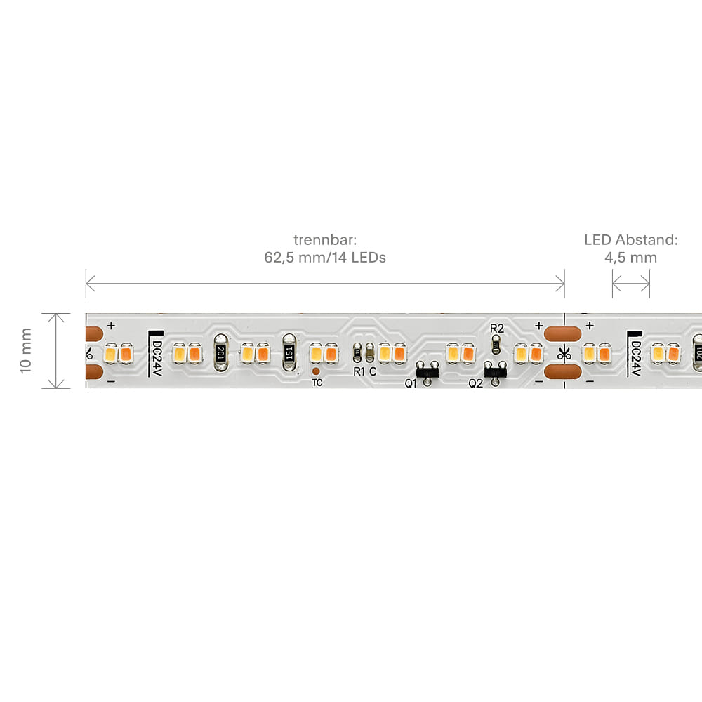 The DIM-TO-WARM LED strip from SIGOR offers an innovative lighting solution with a length of 5 meters. With 224 LEDs per meter, this LED strip ensures even and intense illumination. The special feature is the dim-to-warm function, which allows the color temperature to be continuously adjusted from ultra warm white (1800K) to warm white (3000K). This makes it possible to optimally adapt the light to any mood and situation.