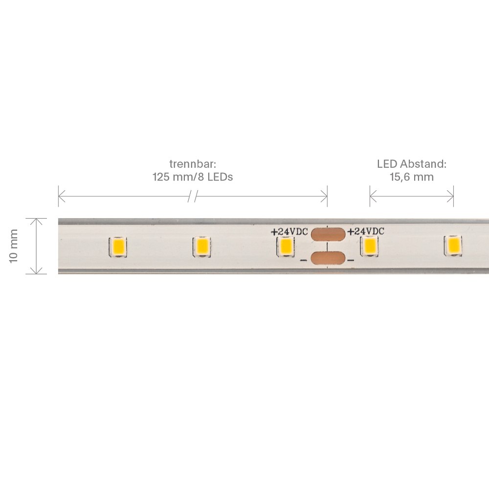 The 5-meter long LED strip features 64 LEDs per meter and operates at 24V. With a warm white light color and a color temperature of 3000K, it provides pleasant lighting. The high color rendering index of 90Ra ensures a natural and realistic color representation.