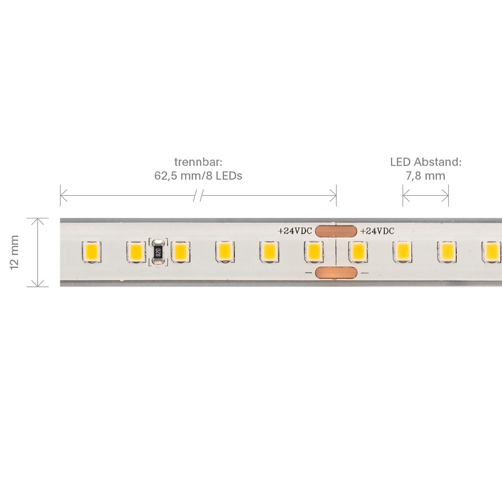 The 9.6W/m PRO LED strip is 5 meters long and has a total of 128 LEDs per meter. With a beam angle of 120° and a color rendering index of 90Ra, this strip provides uniform and natural lighting.