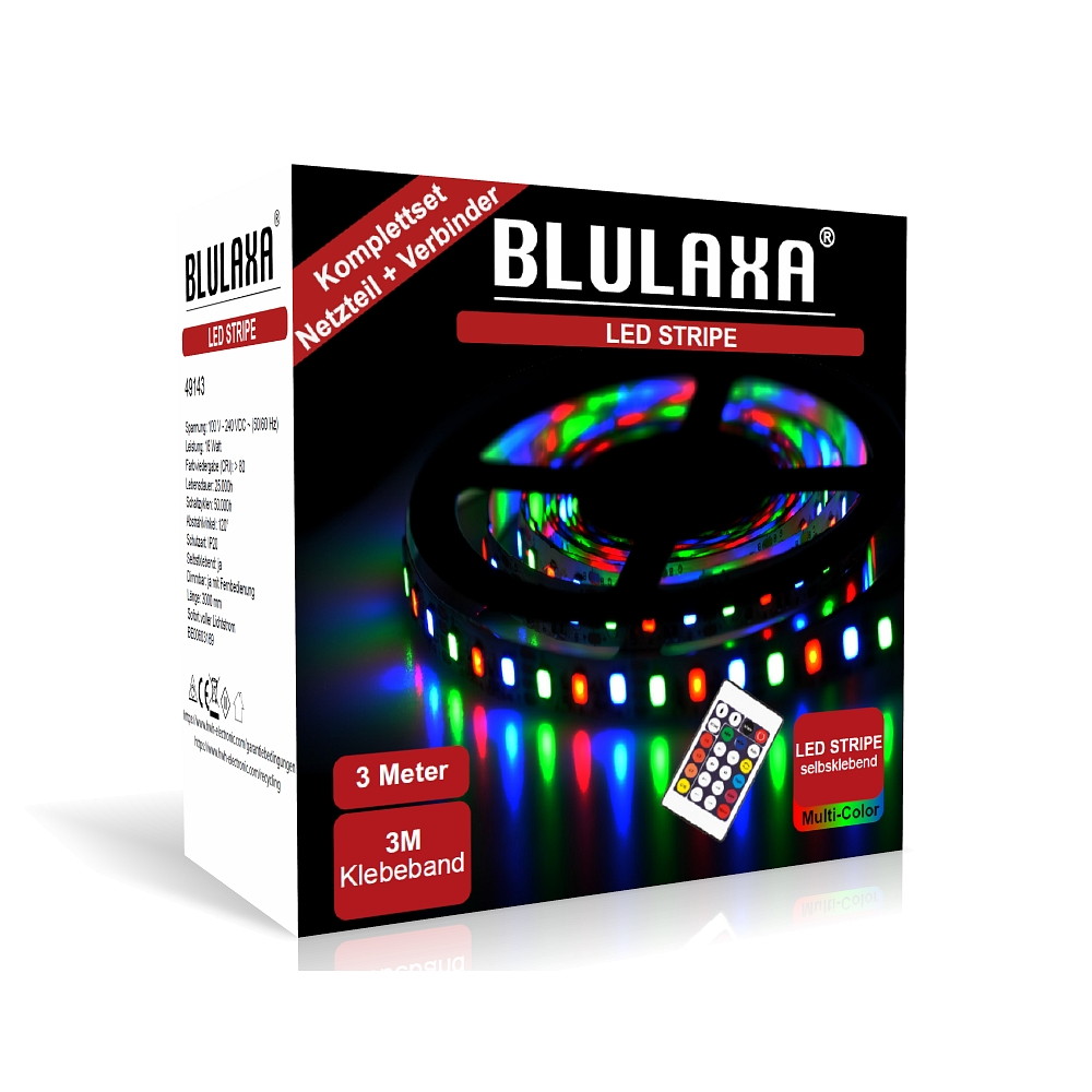 The LED strip set consists of a 300cm long LED strip with a beam angle of 120° and an IP20 protection rating. Thanks to the included 3M adhesive tape, the strip can be easily and quickly mounted.