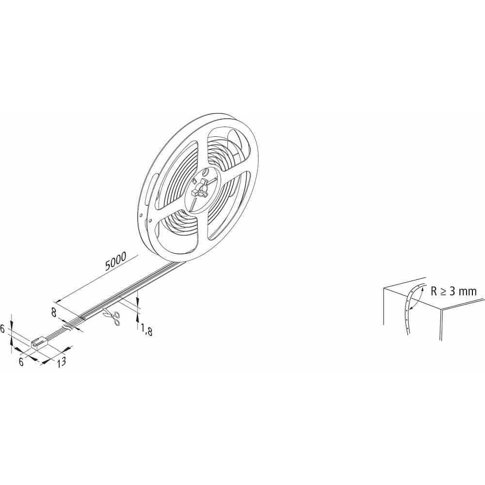 The LED strip is ideal for object lighting, as a flex stripe, or area light. With dimensions of 500cm x 0.8cm x 0.18cm and a weight of only 0.12kg, it is easy to handle. The minimum bending radius is 0.3cm, allowing for flexible installation.