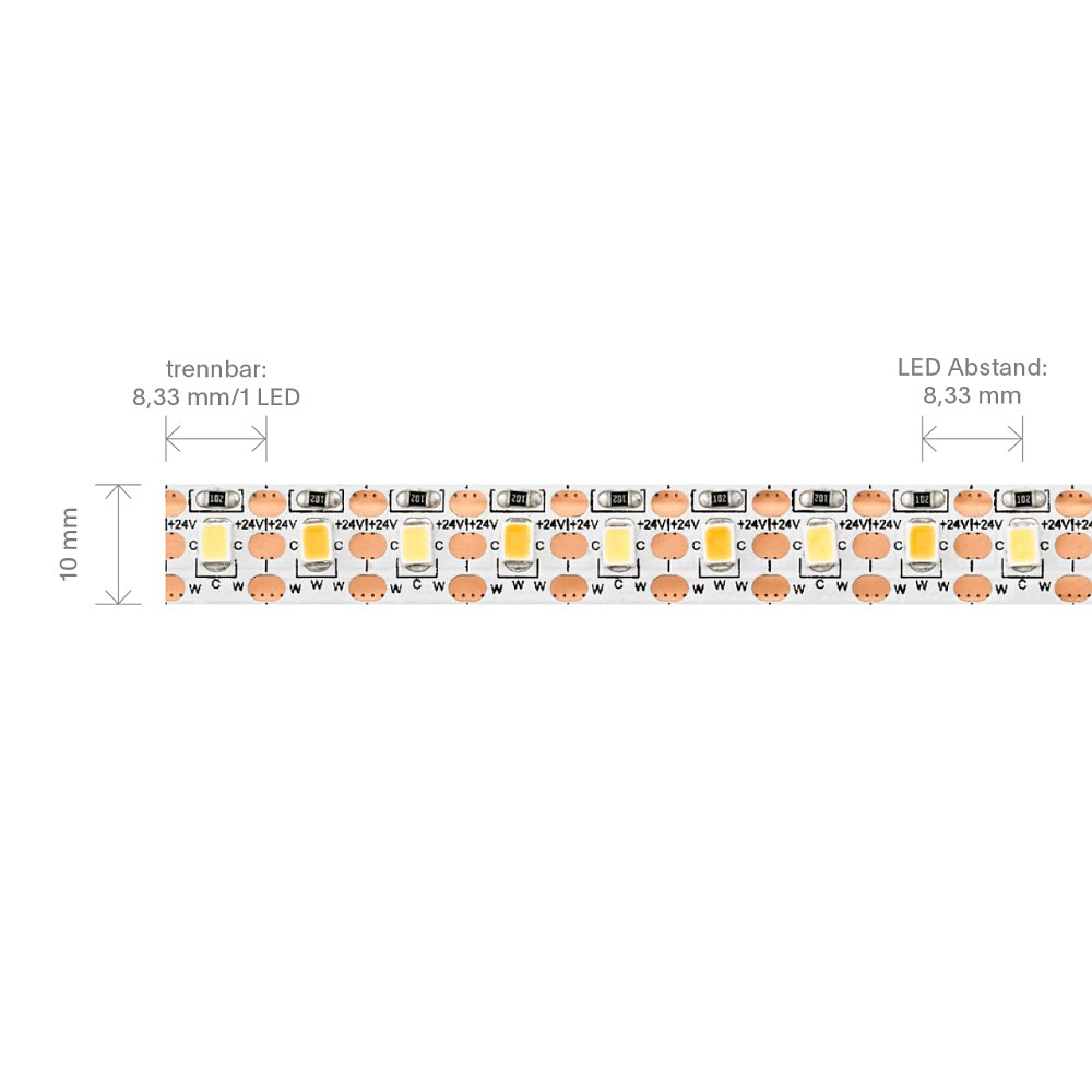 The LED strip TUNABLE WHITE is dimmable and can be individually adjusted. With an operating voltage of 24V and a beam angle of 120°, this LED strip is versatile. The ability to cut the strip every 0.83 cm allows for flexible installation and adaptation to various lighting projects.
