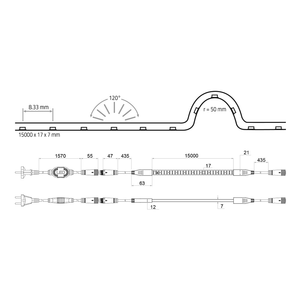 The LED strip is manufactured according to protection class IP65, making it resistant to dust and water jets from all directions. The sturdy housing made of plastic, metal, and PVC ensures high durability against environmental influences. The average lifespan of the LEDs is up to 50,000 hours, ensuring long-term and efficient use. Additionally, the strip is UV-resistant and certified according to RoHS and REACH, guaranteeing the highest quality and environmental standards.