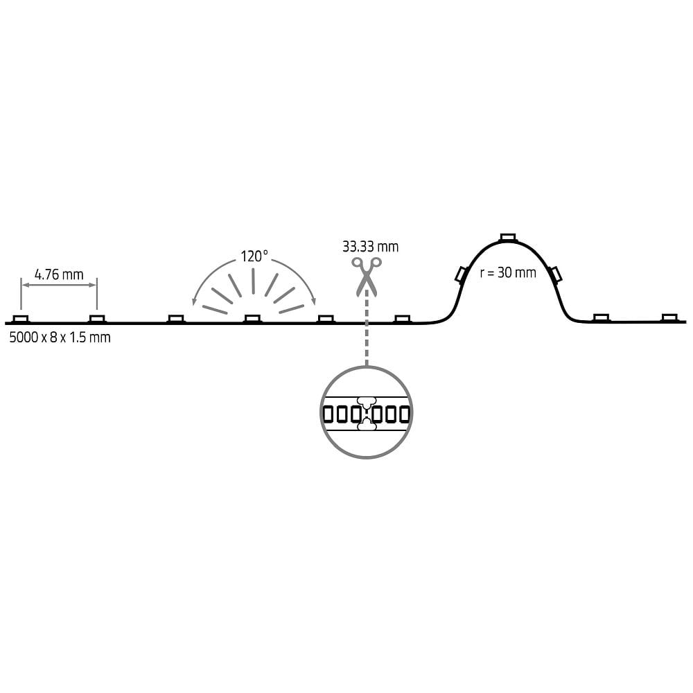 The LED Strip is 5 meters long and can be cut individually every 3.33 cm. With a minimum bending diameter of 6 cm and an LED spacing of 0.48 cm, it offers flexible application options for various lighting projects.