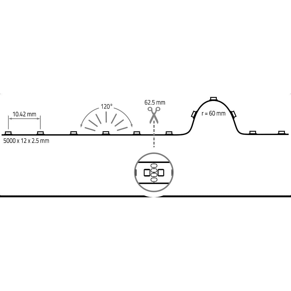 The LED strip has a size of 500 x 1.2 x 0.25 cm and individual sections have a length of 6.25 cm. The minimum bending diameter is 12 cm. The beam angle is 120° and the protection class of the strip is 3. The IP protection rating is IP20.
