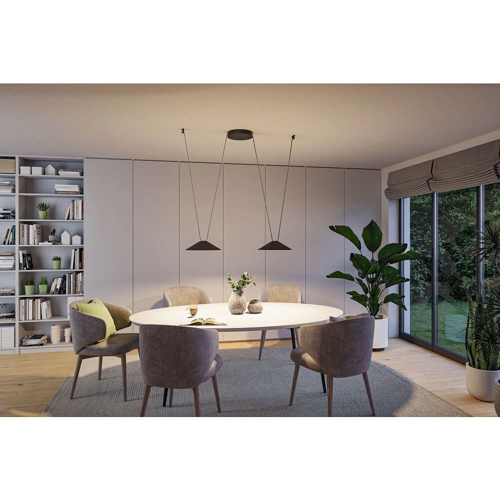 The LED system light ULine PENDEL CONE from Paulmann offers a modern and flexible lighting solution. With a diameter of 35 cm and a height of 9 cm, this pendant light impresses with its flat, conical design and a matte black aluminum surface. The innovative ULine strap system enables easy installation and flexible positioning of the light along a fabric strap, which simultaneously serves as the power source. Thanks to the tool-free click-and-connect technology, the light can be quickly connected and adjusted, allowing for individual light staging in various areas.