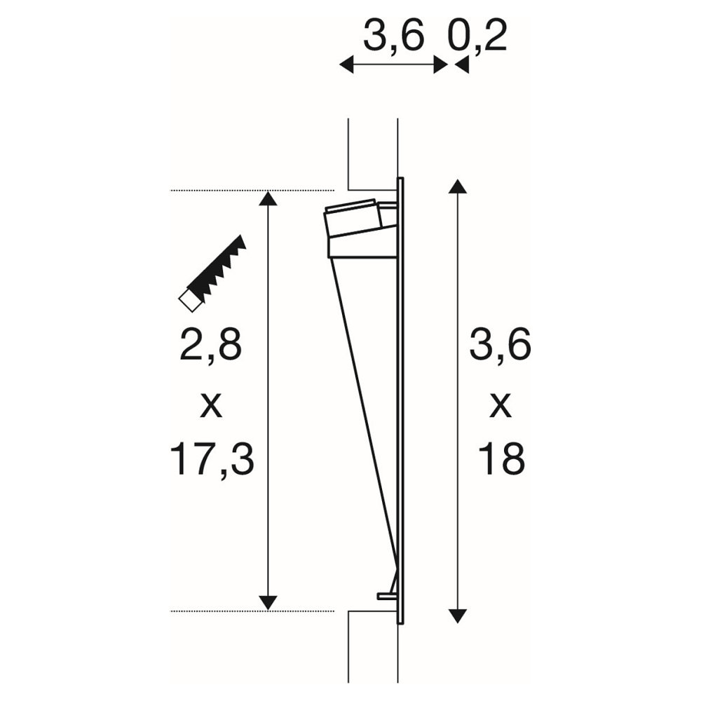 Die Abmessungen der Wandleuchte betragen B∕ H∕ T: 3,6∕ 18∕ 3,8 cm, mit einer Einbautiefe von 5cm. Das Aluminiummaterial sorgt für Langlebigkeit und Stabilität. Die Einbauöffnung hat eine Rechteckform mit einer Länge von 17,3cm und einer Breite von 2,8cm. Das Anschlusskabel hat eine Länge von 30cm und der Steckertyp ist offenes Kabelende.
