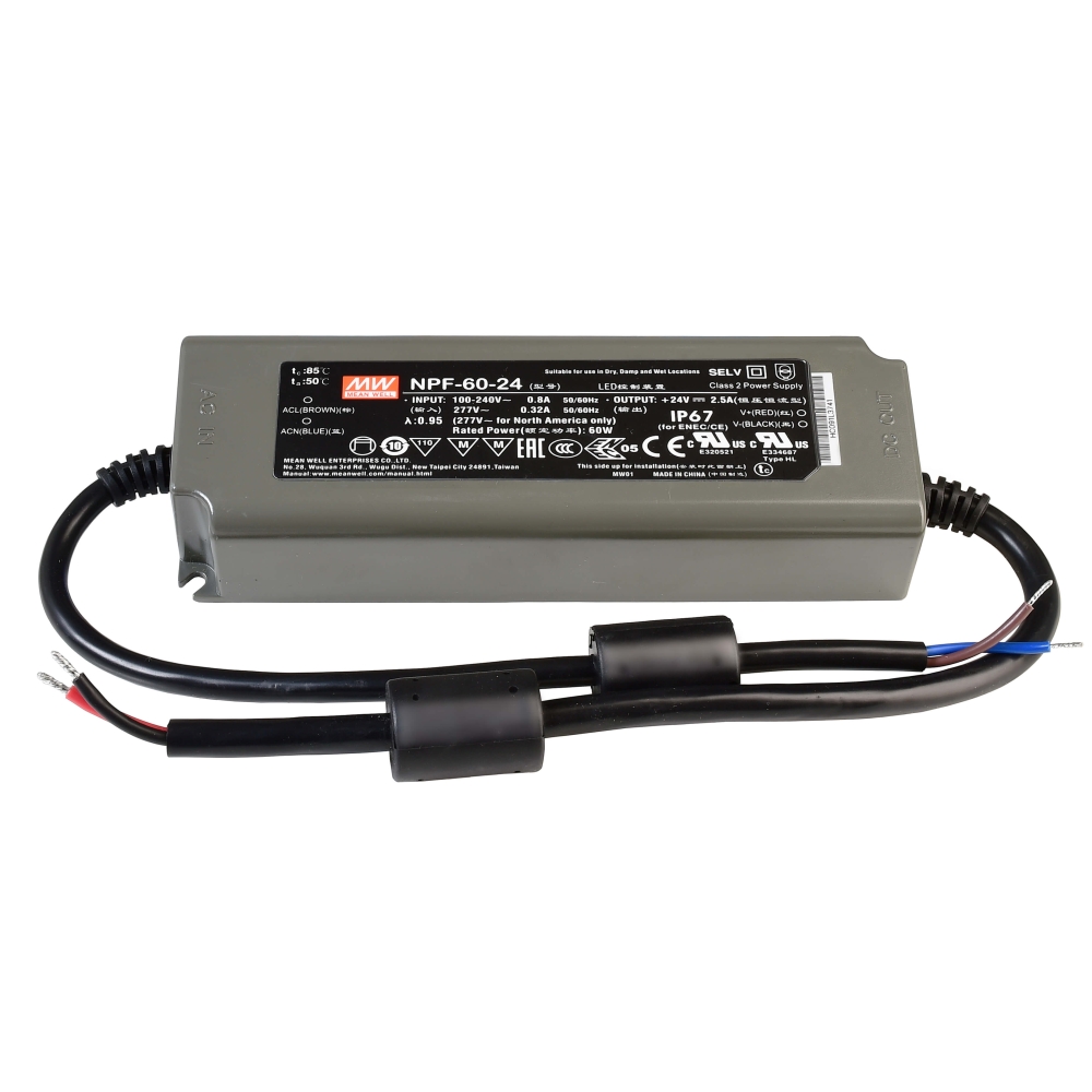 The Meanwell power supply NPF-60-24 is a reliable and powerful device that provides a constant voltage power supply with 24V DC and up to 2500 mA. With a power of 60W, it is ideal for a variety of indoor and outdoor applications.