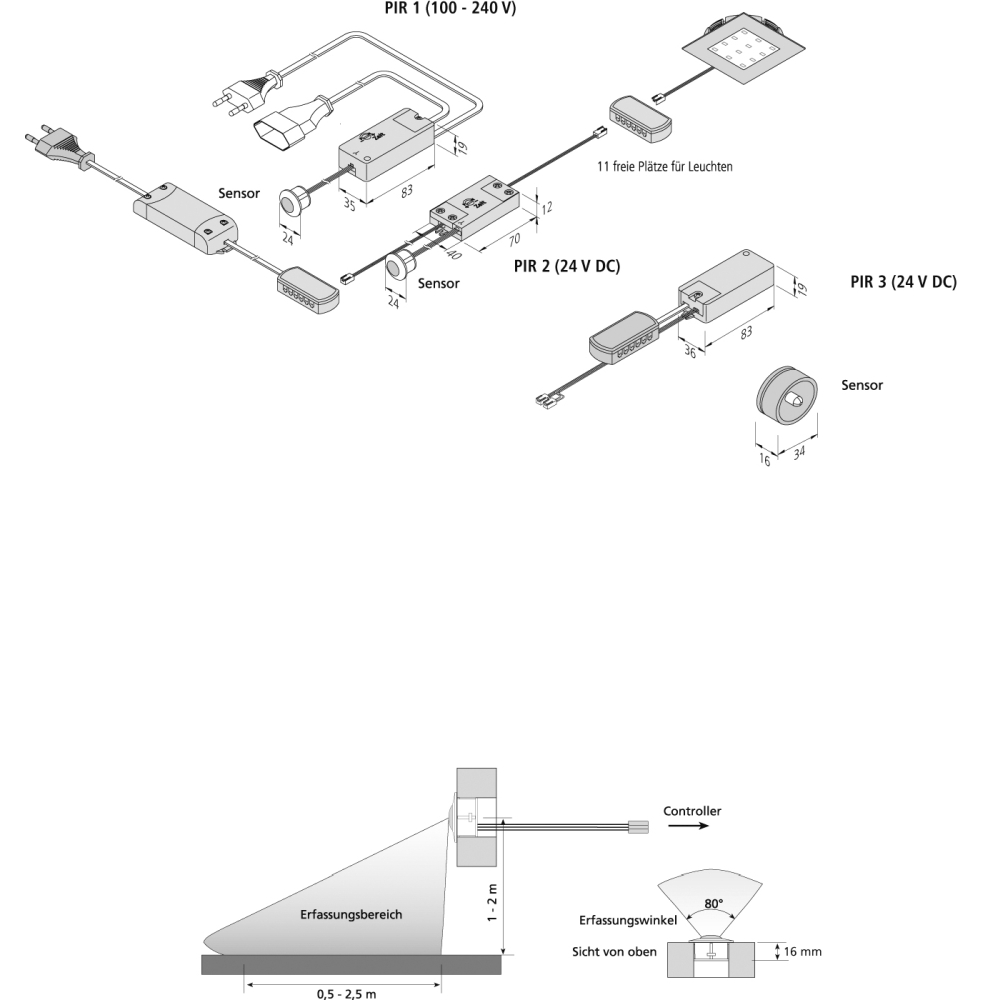 Mini motion detector PIR 2 incl. 20cm cablel with LED24-plug, 20cm + 11-fold distributor, white