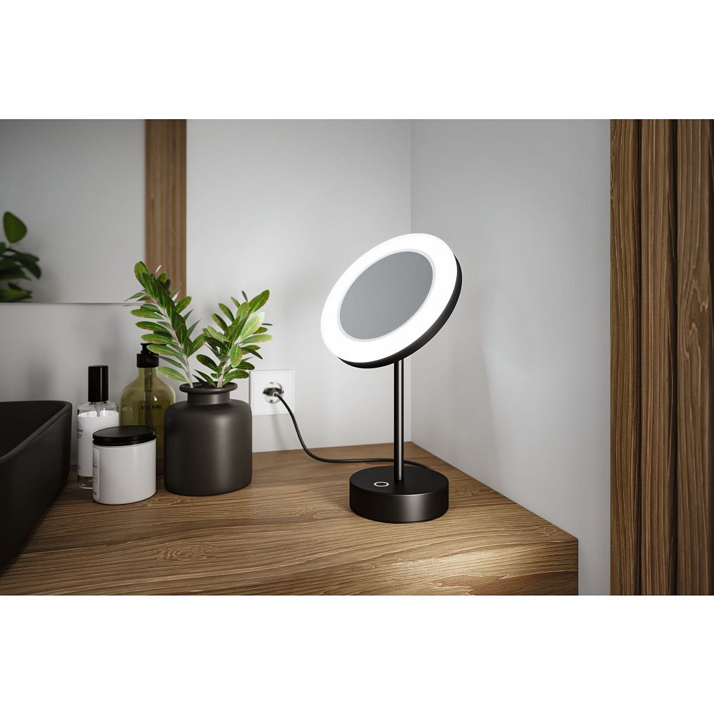 The LED cosmetic mirror MASUA from Paulmann impresses with modern design and practical features. With a diameter of 20 cm, the mirror offers an optimal size for detailed beauty applications. The matte black housing combines plastic and metal for a durable and high-quality finish. The swivel mirror allows flexible positioning so you can always find the perfect viewing angle. Thanks to the stable base, the mirror stands securely on any surface.
