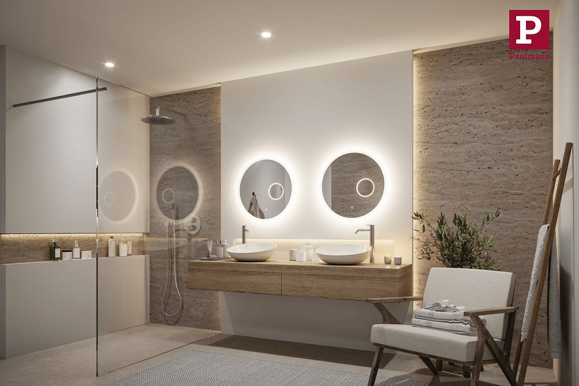 Particularly practical is the integrated 3x magnification mirror, which allows for detailed work during cosmetics or shaving. This additional feature is built directly into the illuminated mirror and provides a magnified view that makes small details visible. With a partial luminous flux of 270 lumens, the cosmetic mirror additionally provides focused lighting that facilitates styling.
