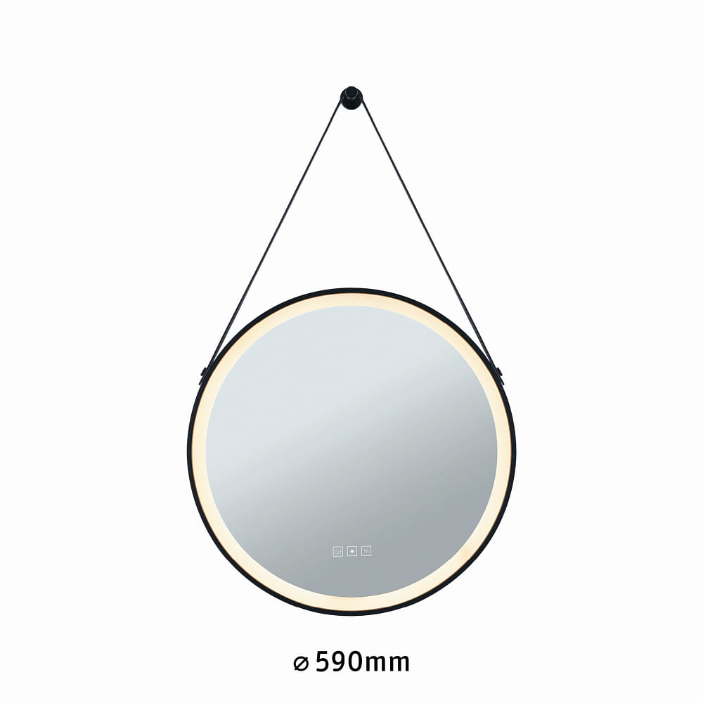 The LED illuminated mirror MIRRA from Paulmann impresses with its round design, featuring a diameter of 59 cm and an elegant black frame made of acrylic and metal. The integrated leather strap gives the mirror a special touch, making it a stylish highlight on any wall. With a protection rating of IP44, the mirror is robust and reliable. The modern LED technology offers a light output of 750 lumens while consuming only 23.5 watts, which corresponds to a conventional 86-watt incandescent bulb. The LED lamps have a lifespan of up to 30,000 hours, ensuring long-lasting use.