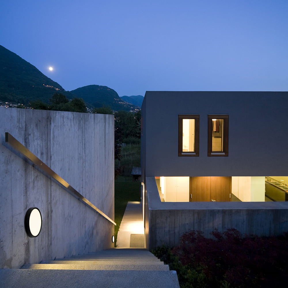 The LED outdoor wall light EYE from Brumberg is ideal for illuminating entrances, terraces, stairs, parking lots, or facades. With a round light output and a light color that can be adjusted via a rear slide switch (warm white, neutral white, or cool white), it offers versatile applications.