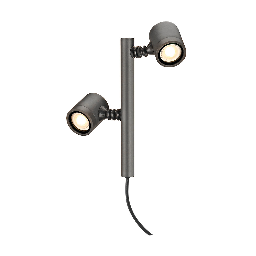 The MYRA SPOT DOUBLE is a two-bulb, rotatable and tiltable spotlight from the outdoor series MYRA. It is ideal for interchangeable GU10 bulbs and offers direct light distribution. With a sturdy construction and an IK02 basic protection against vandalism, the lamp is durable and safe to use.