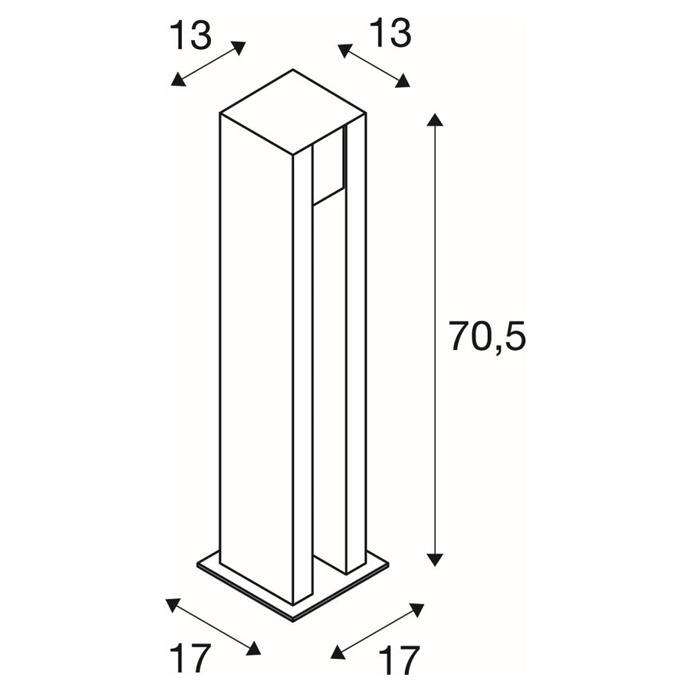 Mit der Schutzart IP55 ist die Stehleuchte gegen das Eindringen von Staub und Strahlwasser geschützt. Die Schutzklasse 1 sorgt zudem für Sicherheit bei der elektrischen Installation. Die kompakten Abmessungen von 17 cm Breite und Tiefe, sowie 70,5 cm Höhe machen die Leuchte vielseitig einsetzbar, ohne dabei zu viel Platz einzunehmen. Der Leuchtenkörper selbst misst 13 x 13 cm, während die Bodenplatte 17 x 17 cm groß ist.