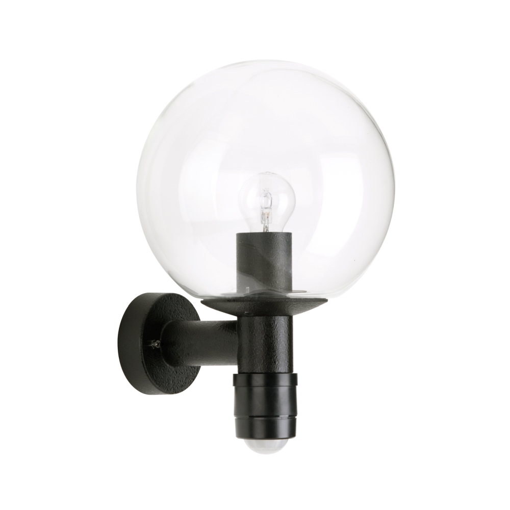 Outdoor Wall luminaire Type No. 0639 with motion sensor (Type No. 0641), glass ball Ø 25cm, E27, black matt / crystal glass
