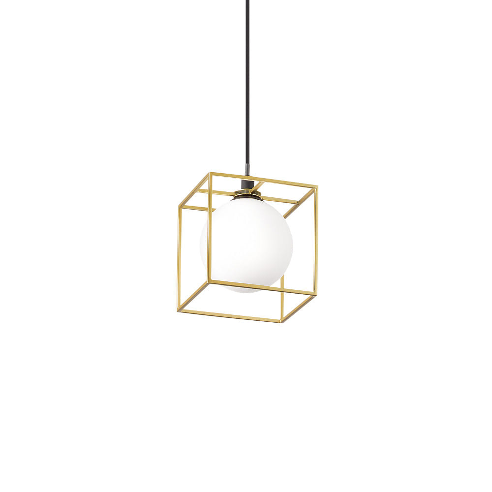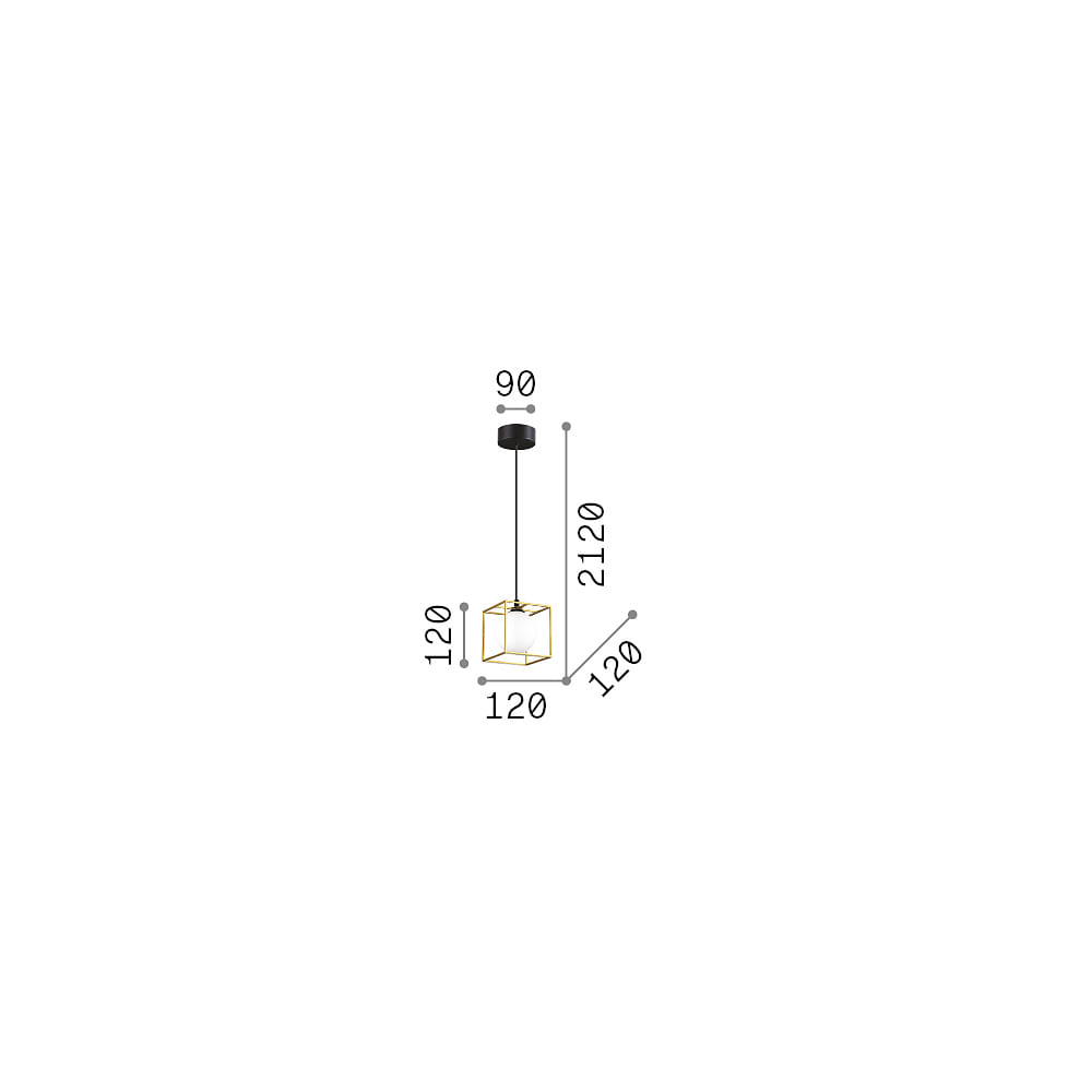 The pendant light LINGOTTO has a cube-shaped, matt brass-framed diffuser on a black painted base. The overall dimensions of the luminaire are 12x12x212 cm, the luminaire body measures 12x12x12 cm, the glass has a diameter of 10 cm, and the canopy has a diameter of 9 cm. The light source has a diameter of 1.9 cm and a length of 4.9 cm.