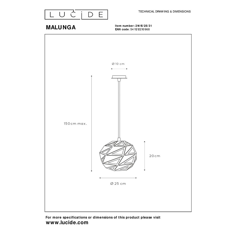 The pendant light MALUNGA comes from the renowned brand Lucide, known for high quality and modern design. With its timeless elegance, it is a great addition to any interior design.