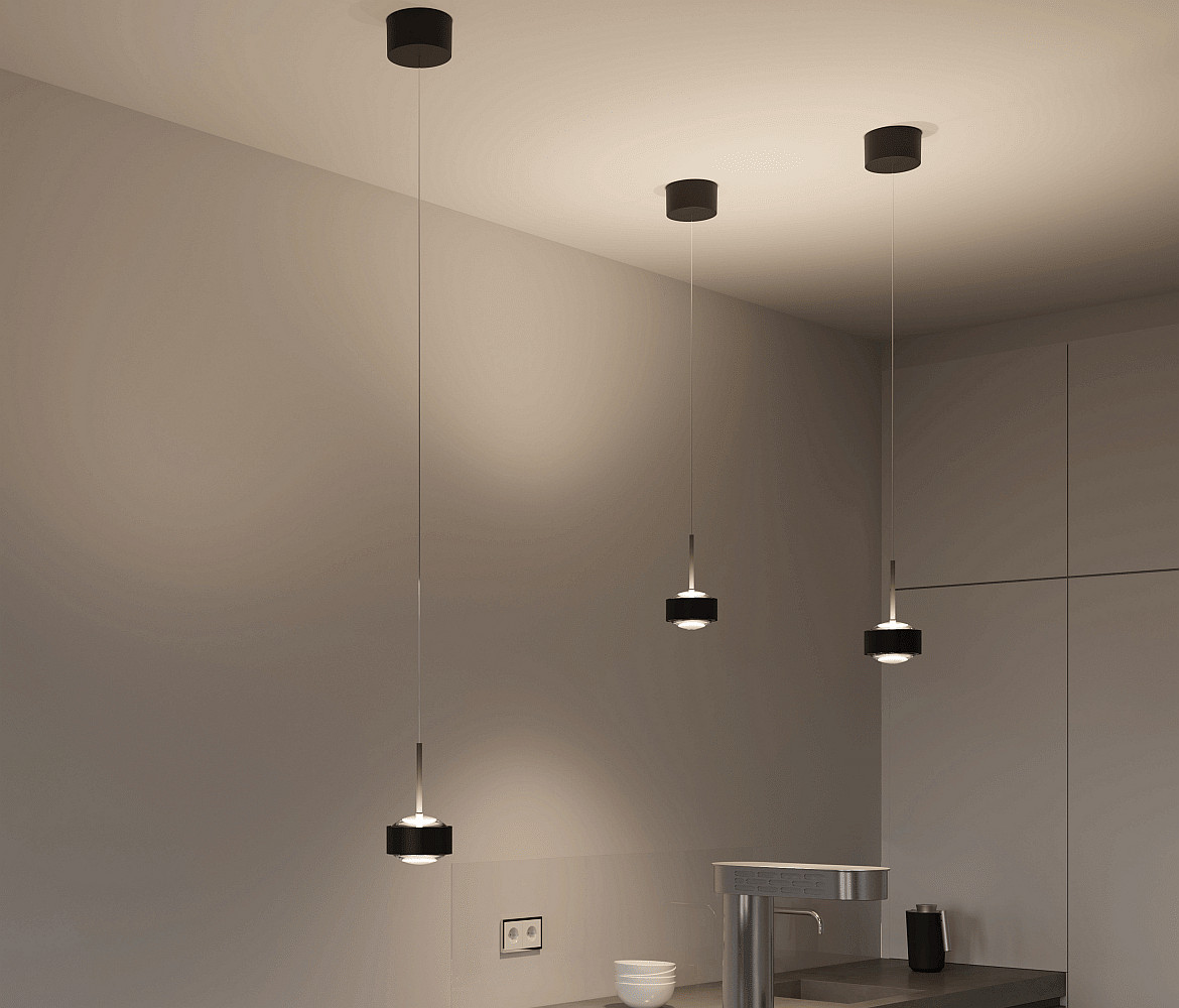 The pendant length of the PUK! PRO 120 MOTION can be shortened from 60 cm up to a maximum of 180 cm, allowing it to be individually adjusted to the room height and desired style. Additionally, the lamp is dimmable via phase-cut dimmers, which allow stepless brightness control. A dimmer is not included in the delivery but can be purchased separately.
