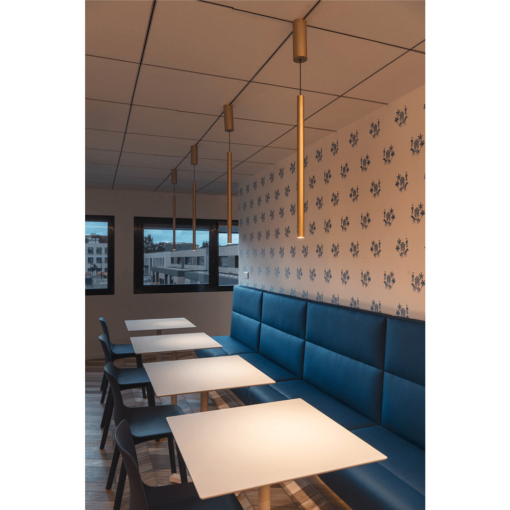 Die Leuchte hat einen Durchmesser von 6cm und eine Höhe von 60cm. Sie verfügt über einen Ausstrahlungswinkel von 40° und eine Betriebsspannung von 220-240V. Die Pendellänge ist kürzbar und beträgt standardmäßig 150cm.