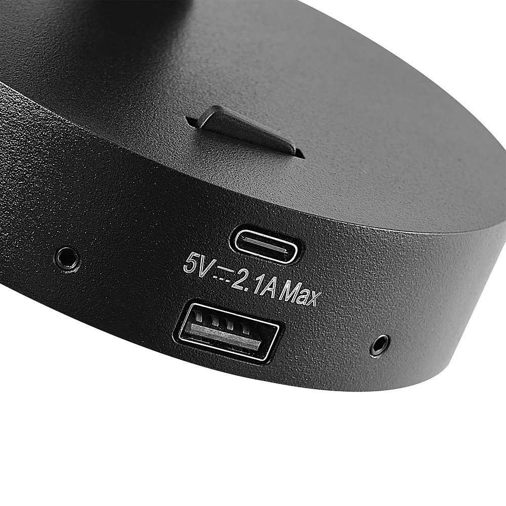 A special highlight of this lamp is the two integrated USB charging ports on the underside of the base. These include a USB-A and a USB-C port, which together offer a maximum current capacity of 2.1 amperes. The built-in converter safely converts the mains voltage of 230V AC to 5V DC. This allows smartphones, tablets, or other accessories to be conveniently charged or powered without the need for additional chargers.