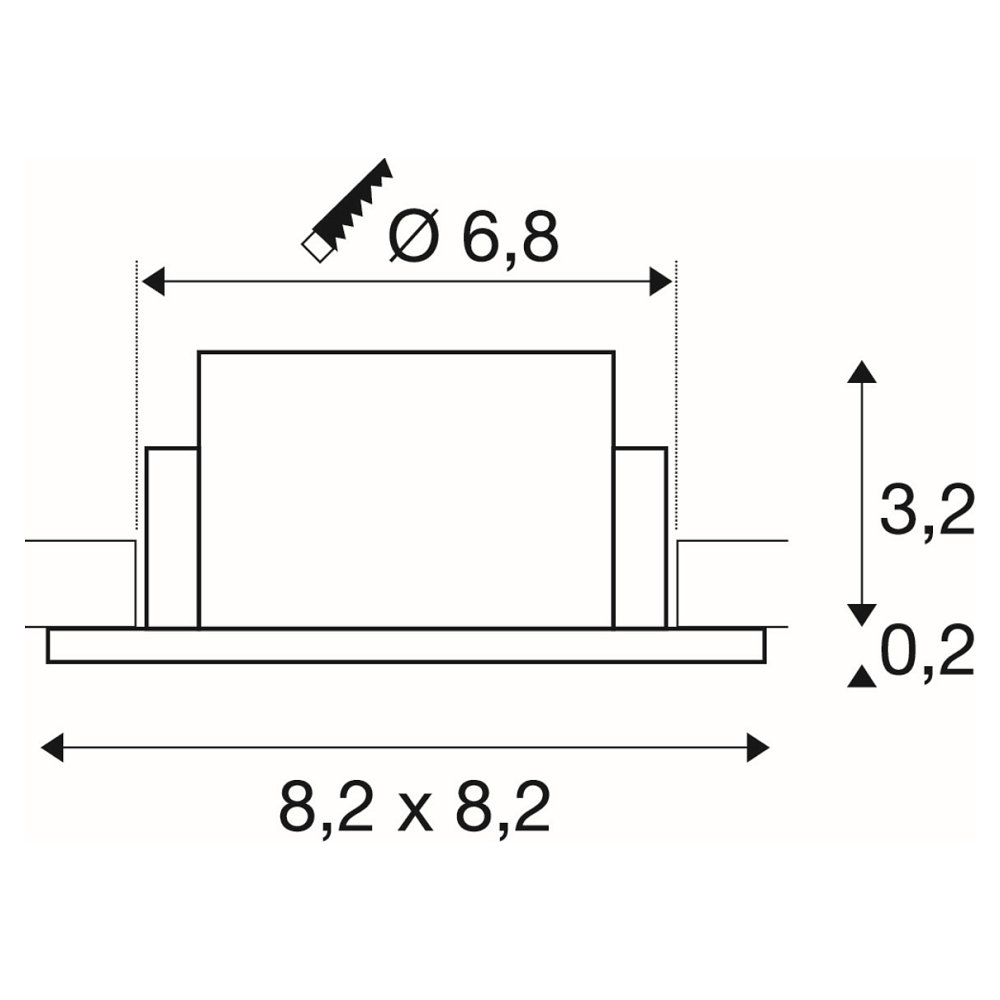 The size of the recessed light is L/W/H: 8.2/8.2/3.4 cm and it weighs only 0.1 kg. The installation opening has a diameter of 6.8 cm and the shape of the light is square. The recessed light is made of aluminum, ensuring a sturdy and durable construction.