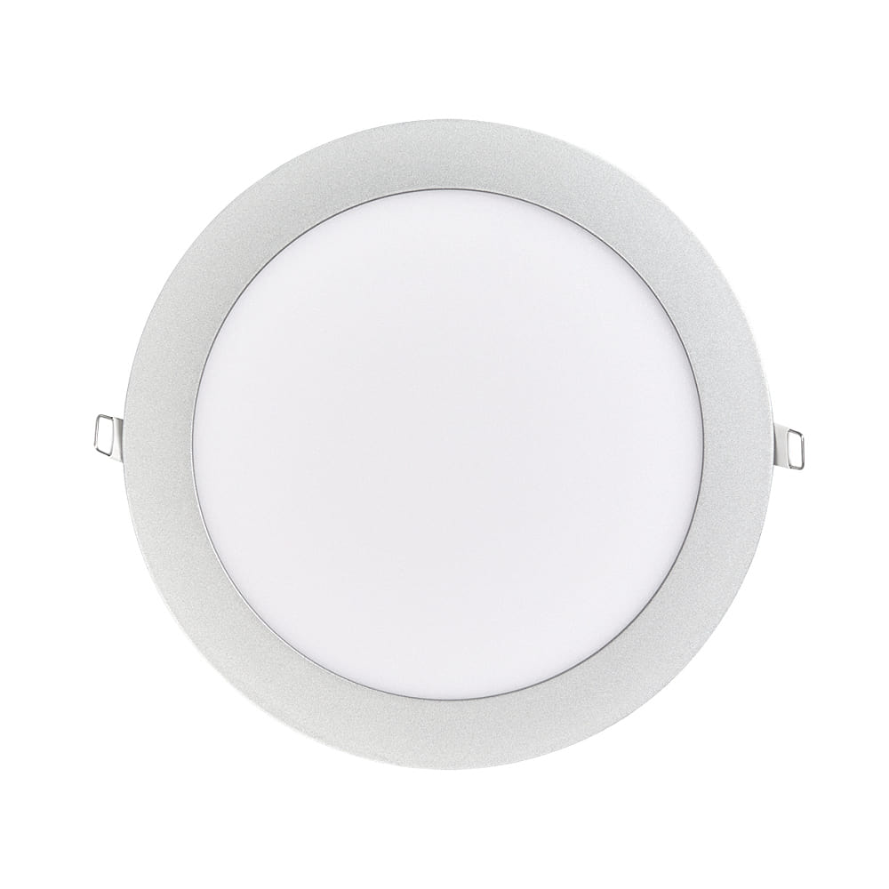 The recessed panel operates with a constant current of 350 mA, supplied by a separate LED driver (not included). Operation is at a supply voltage of 37V~ and a safe low-voltage system (SELV), enhancing safety during use. The package includes practical clip springs that allow for quick and secure attachment of the luminaire. The installation depth is only 2.5 cm, and the cutout diameter for the circle is 20.5 cm, facilitating integration into various ceiling or wall surfaces.