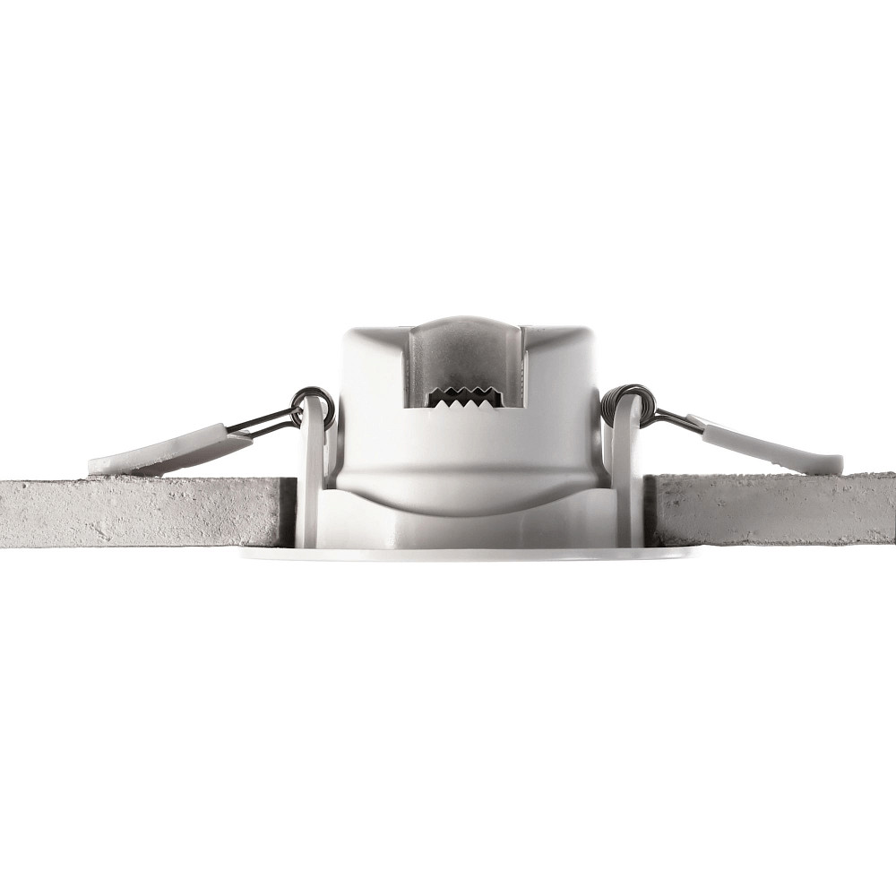 The downlight is made of robust plastic and, with its protection class 2 and IP20 rating, offers safe and reliable usage. Installation is straightforward using fixed spring clips that ensure secure mounting in the ceiling. Connection to the 220-240V mains is made via a terminal block, while the luminaire operates with a power factor of 0.9, supporting efficient power usage.